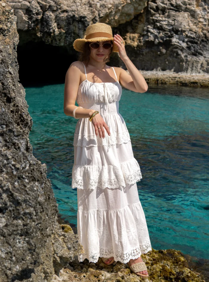 Romantyczna VIVIENNE to idealna opcja na cieplejsze dni. Uszyłam ją z połączenia batystu bawełnianego z efektownym haftem. Model na ramiączkach z wiązanym dekoltem, pas z gumonici pięknie podkreśla talię i biust, całość dopełniają ozdobne falbanki. Tkanina jest delikatna a jej splot idealnie przepuszcza powietrze. Dzięki temu sukienka zapewni nie tylko wyjątkowy efekt wizualny, ale też wpłynie na samopoczucie osoby, która będzie ją nosić. Sukienka ma wszytą podszewkę. 100% handmade, zaprojektowana i uszyta w domowym zaciszu.